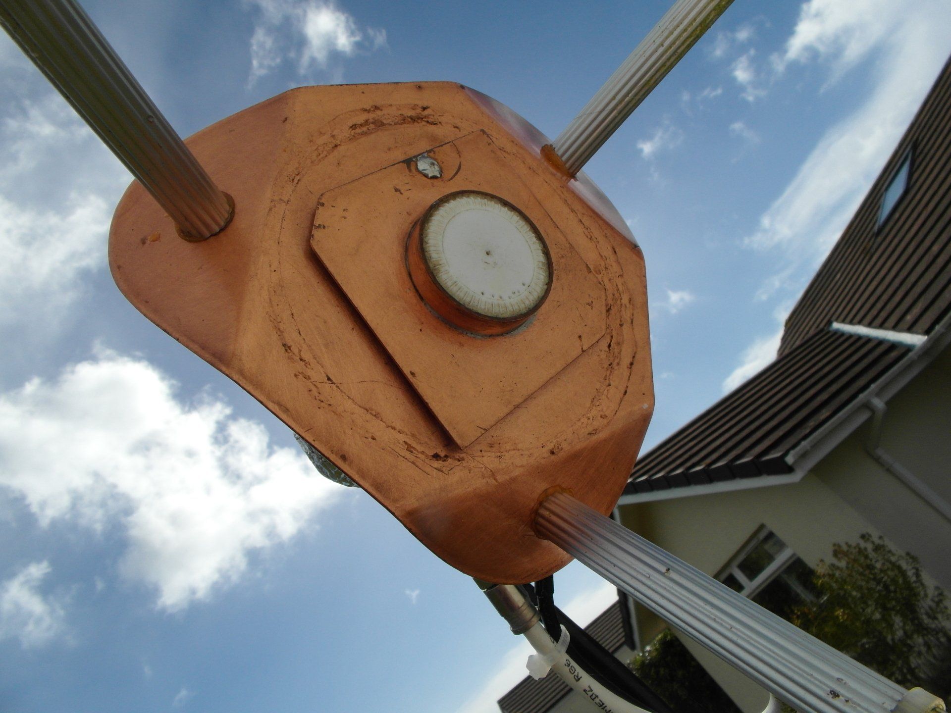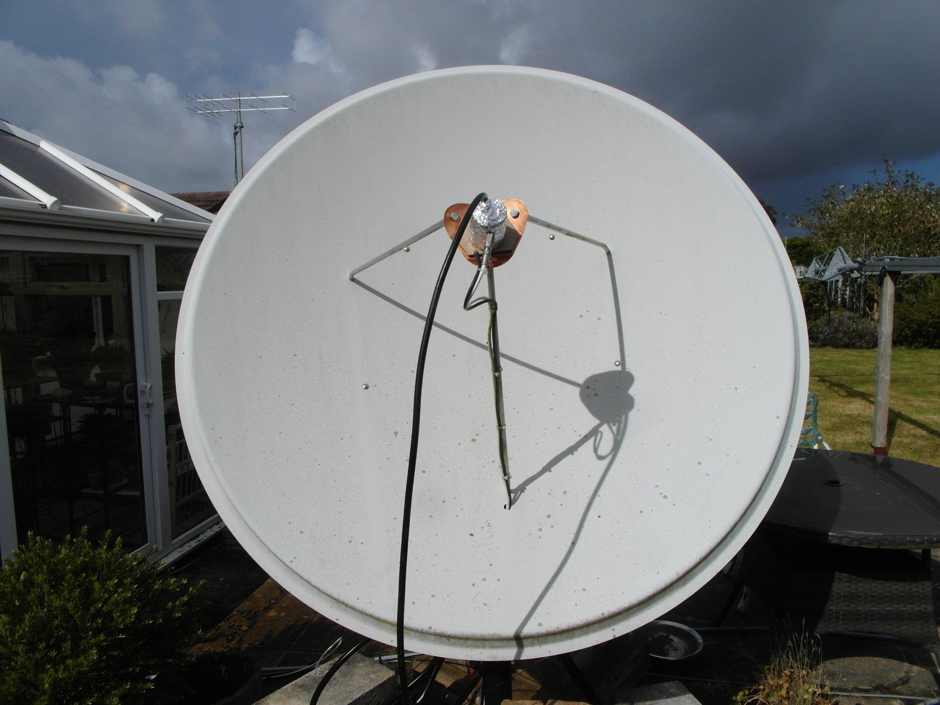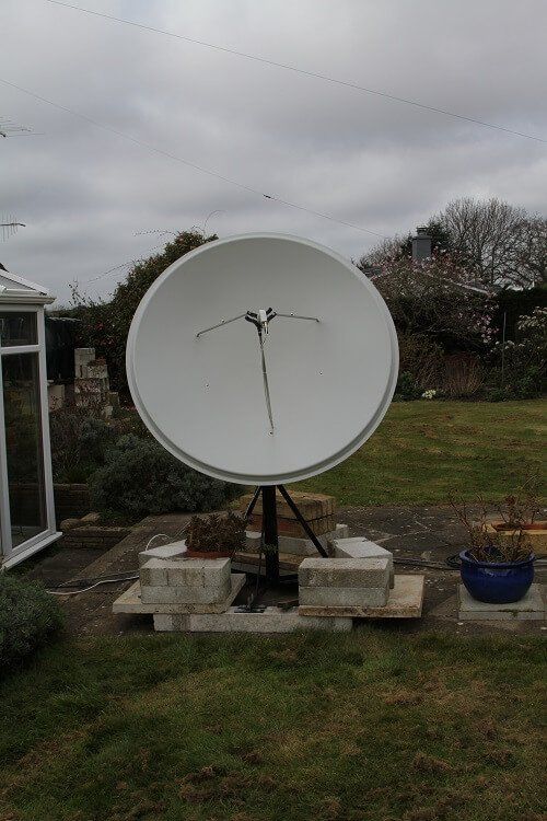 The antenna is a 1.4m prime focus dish from www.satellitesuperstore.com . The ratio of focal length to aperture size (F/D Ratio) is 0.41, Gain at 10.95GHz 41.8dB. As you see, the stand is kept in place with ~ 280kg of lintel, breeze block and slab.