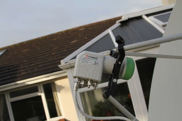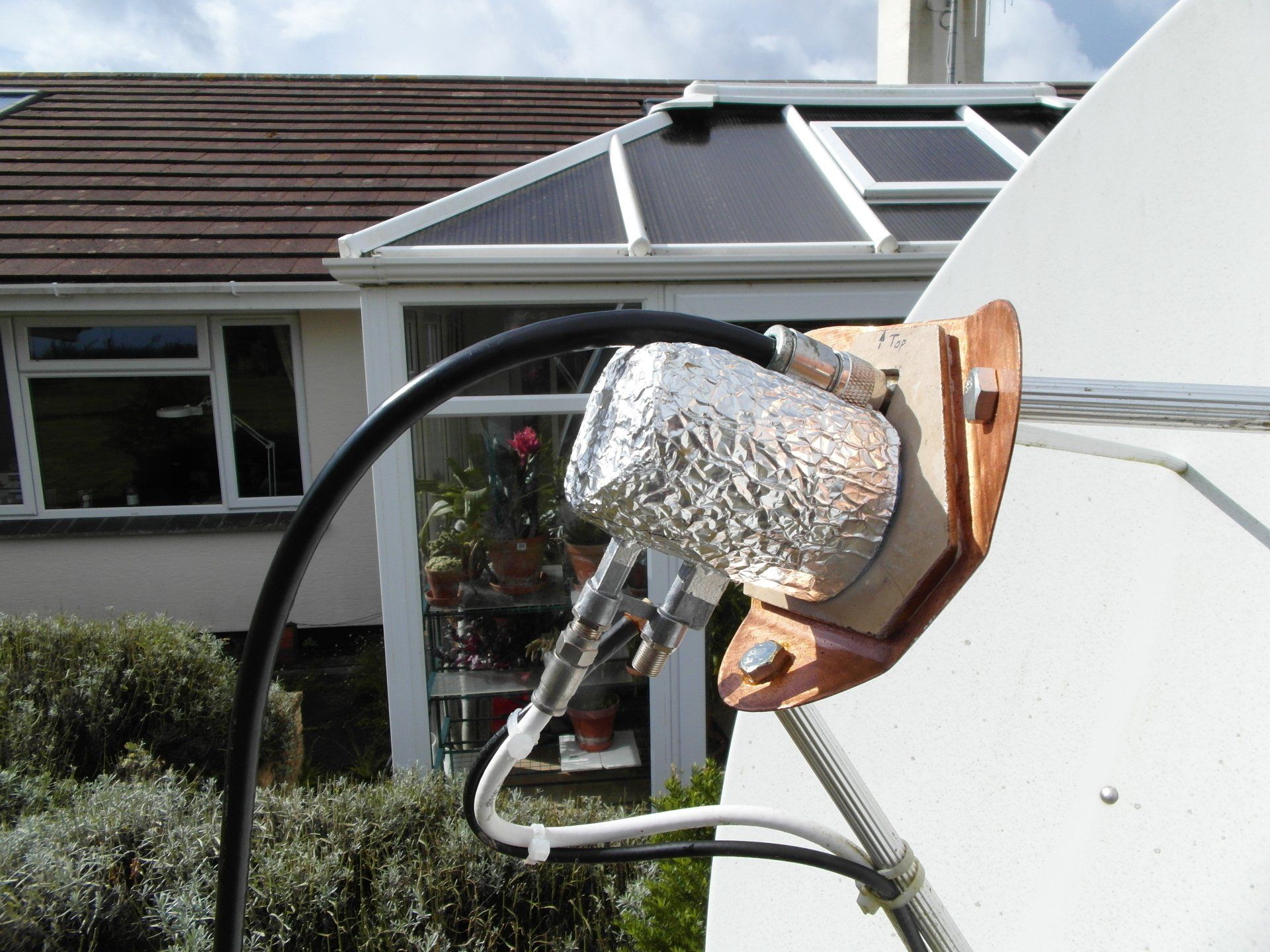 Testing with an Octagon 0.1db Quad High Gain HD Ready Universal low-noise block downconverter (LNB). This is very sensitive but drifts - for SSB / CW it must be modified, either change the crystal to a TCXO or add support for an external reference such as the Leo Bodnar GPSDO. Drift is much worse in the daylight as it is temperature dependent.