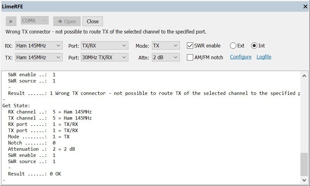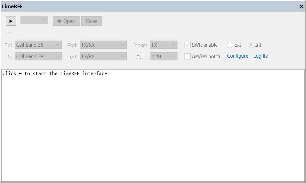 Select the port which corresponds to your Lime RFE unit, then press Open. The Lime RFE starts with the default values.