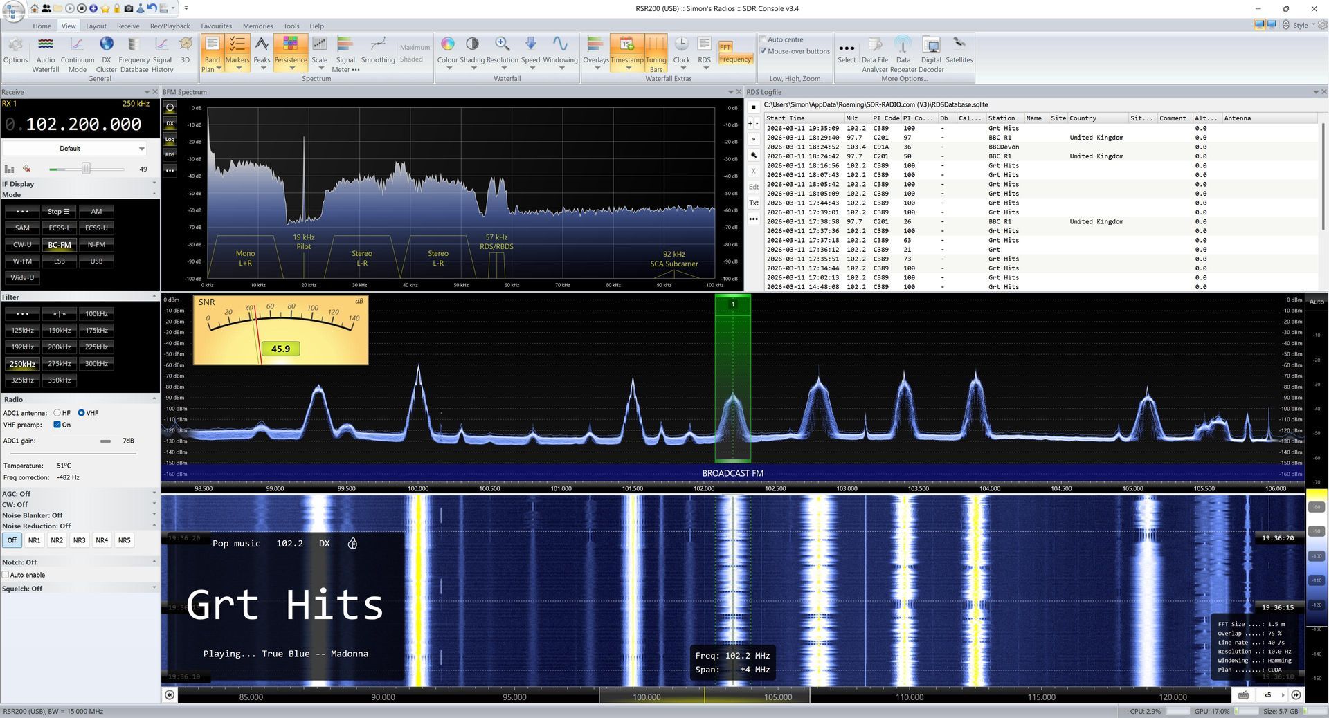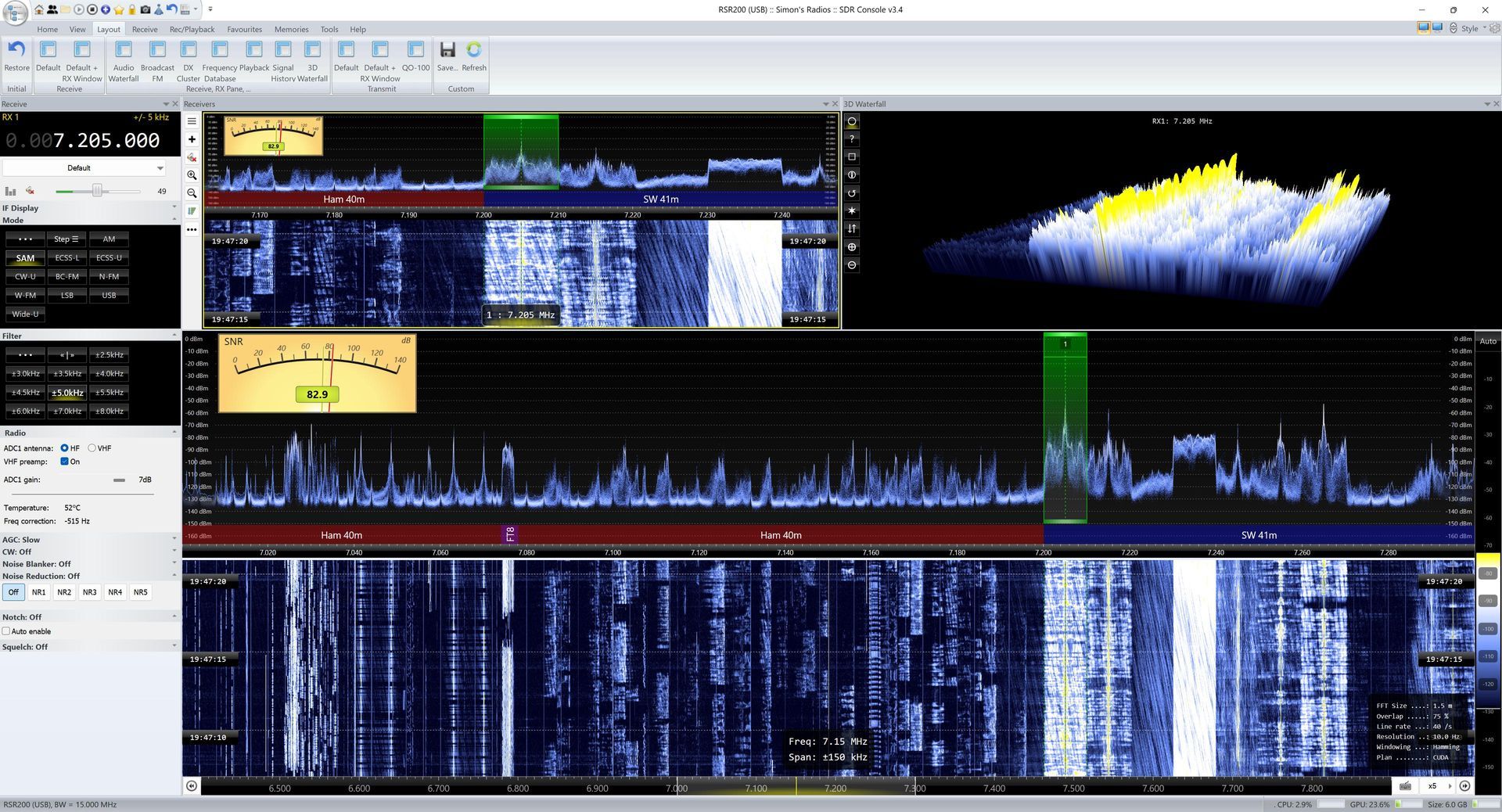 November 1st, 2025 Analyser Analyser tag window change, as suggested by Jim. Analyser tags now saved and restored correctly. Analyser font size now supports small, medium and large. Analyser loads saved projects faster. Saving project now much faster and uses less memory. More display lines available if you have enough RAM: Less than 16GB then 50,000 lines. 16GB to 32GB then 100,000 lines. 32GB or more then 250,000 lines. Fixed minor font issue with definition window. Fixed issue scrolling when more than 32768 lines in display. Data File Playback Selecting a playback folder now creates the list of files much faster. Emulation Added a diagnostic check for the use of emulators. This code only works on W10 and above, so I dynamically load IsWow64Process2 from kernel32 which avoids issues on older versions of Windows. In the logfile you see something like this: 05:23:48.185: Vendor ....: GenuineIntel 05:23:48.185: Brand .....: Intel(R) Core(TM) Ultra 7 265K 05:23:48.185: - 05:23:48.185: x86 Emulation: 05:23:48.185: Process .......: 0x0000, "Not emulated" 05:23:48.185: Architecture ..: 0x8664, "AMD64" 05:23:48.185: - Favourites Updated the default 60m bandwidth. Changed Broadcast :: VHF CCIR title to Band II. Groups now have user-selectable files. Default definitions renames to main. Changed the ribbon bar, Selection entry to Options (see image below). The dropdown options have been replaced with a single window, allowing more room for text. Locked Receivers If the program is stopped or a favourite created when a receiver is locked, this caused problems with the receiver being locked but no indication. With this kit receiver lock state is not applied in a favourite definition. Logfile Automatically save the logfile when closing, really added so I can check program responding correctly to Shutdown and Restart. Old logfiles are purged after the program has been running for one minute. Logging Added logbook FA option as below, FA is the command to read/write RX1. Narrow FM Added 150Hz CTCSS squelch tone. De-emphasis is now optional, selected from: Ribbon bar, Receive, Mode..., Narrow FM. Persistent Display Got a crash inside the persistent display logic, my sanity checks weren't good enough so have improved this. Remote Server After connecting to a remote server, the input fields can now be edited to change connection parameters. Ribbon Bar View panel tidied up. Signal Meter (SMeter) Added more presets for the Signal meter, Ribbon bar, View, Spectrum, Signal Meter. Spectran ECO Changed SPECTRAN path order to pick up DLLs from the SDK folder rather than the main folder. Status Bar GPU, Audio entries on status bar now optional, selected from Program Options, Performance, CPU Memory. System Shutdown / Restart If SDR Console is running when the system shuts down or restarts then SDR Console closes gracefully. What happens - five seconds after SDR Console receives the SHUTDOWN message a timer calls the OnClose() processing, so you have five seconds to about the shutdown / restart. Text Size Fonts now scale correctly when a non-default Accessibility > Text Size is selected (see image).