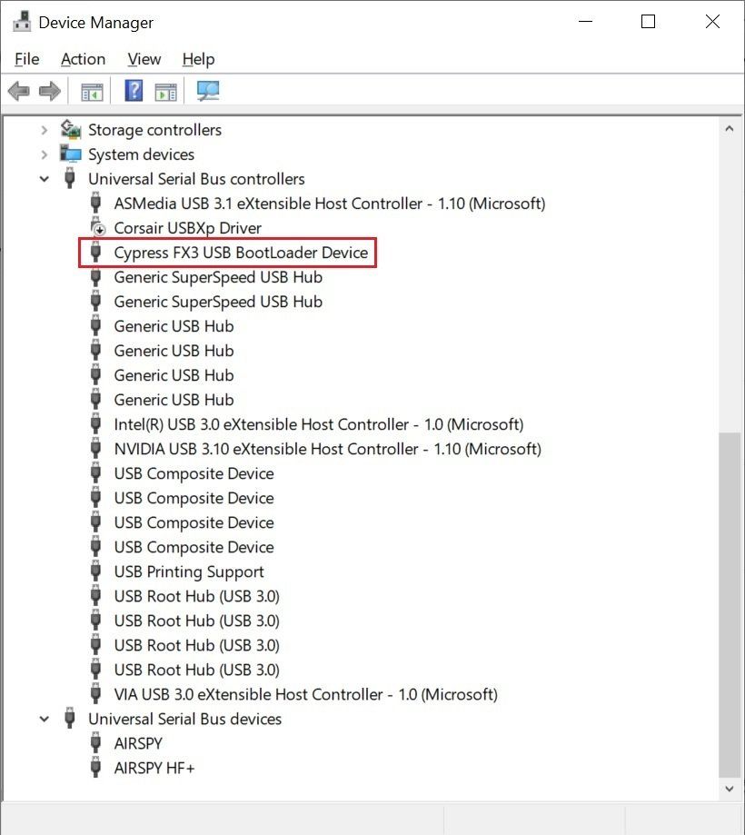 When you connect the RX-666 to your computer it will either show up as a WestBridge or Cypress FX3 device.