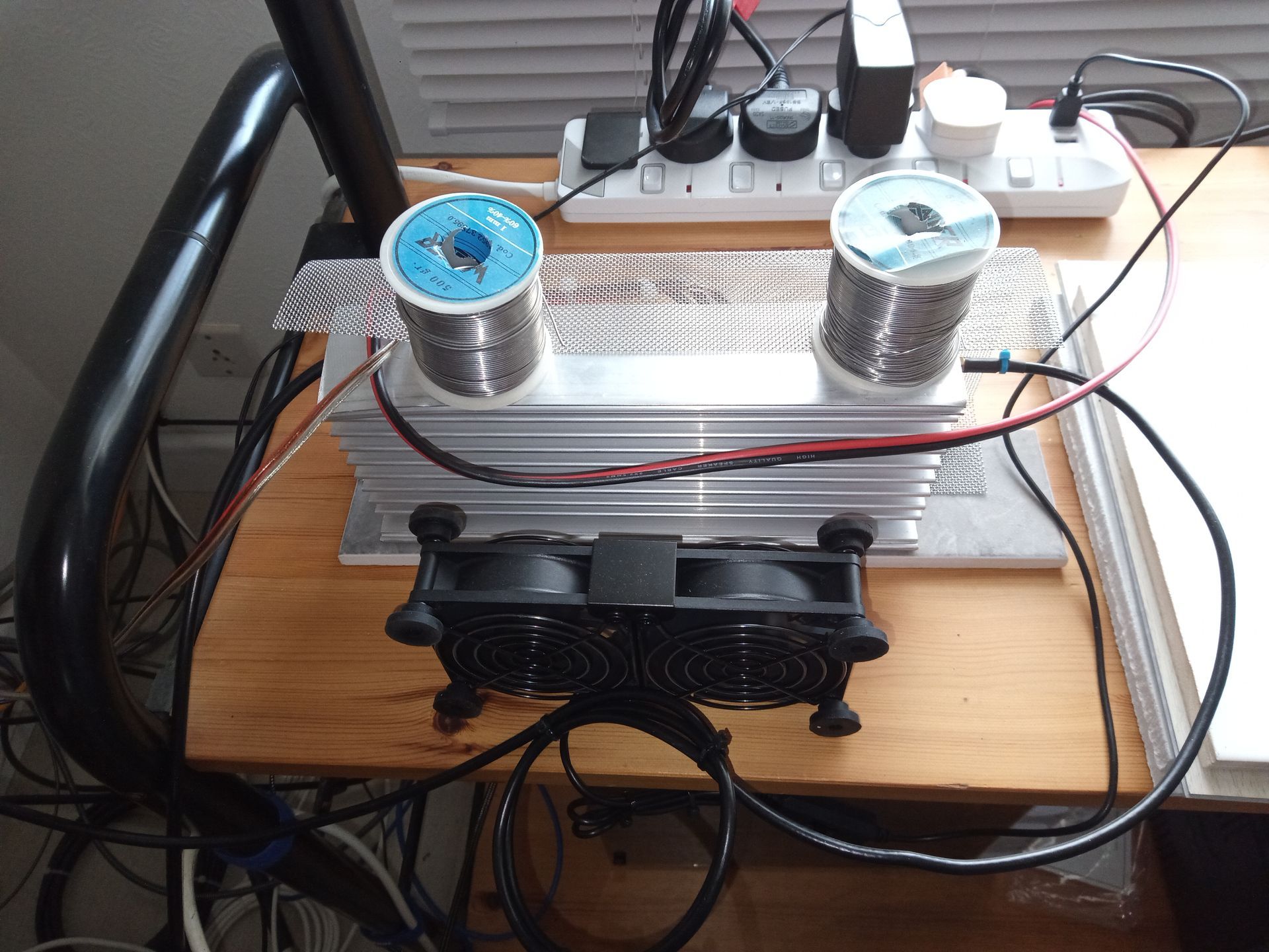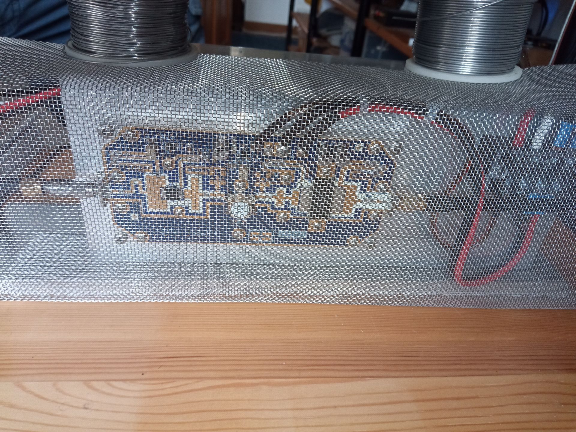I haven't finished the screening, so it's held in place by two rolls of solder! Cooling comes from a pair of 80mm USB variable speed fans. Temperature does not exceed 35°C.