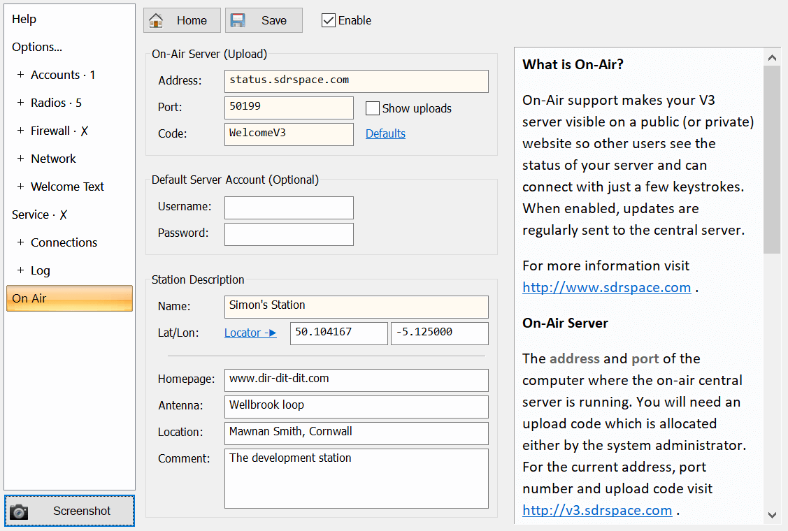 On-Air support makes your V3 server visible on a public (or private) website so other users see the status of your server and can connect with just a few keystrokes. When enabled, updates are regularly sent to the central server. For more information visit http://www.sdrspace.com .