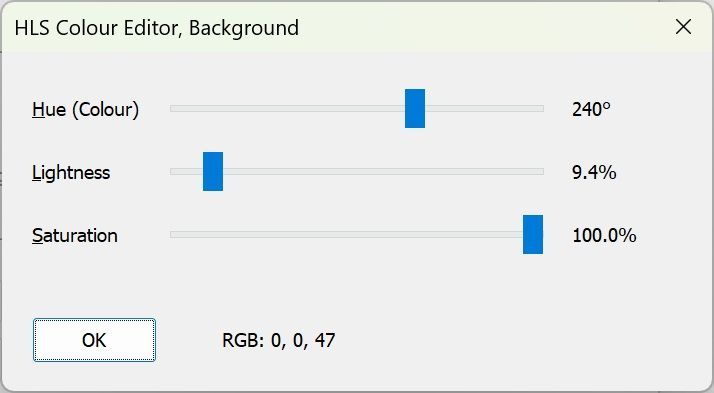 The Appearance window has been refreshed, simplified. The defaults have been changed to have a dark background and a light text. A HLS (Hues, Lightness, Saturation) colour editor has been added, selected from the colour-wheel button to the right to the main colour-selection options.