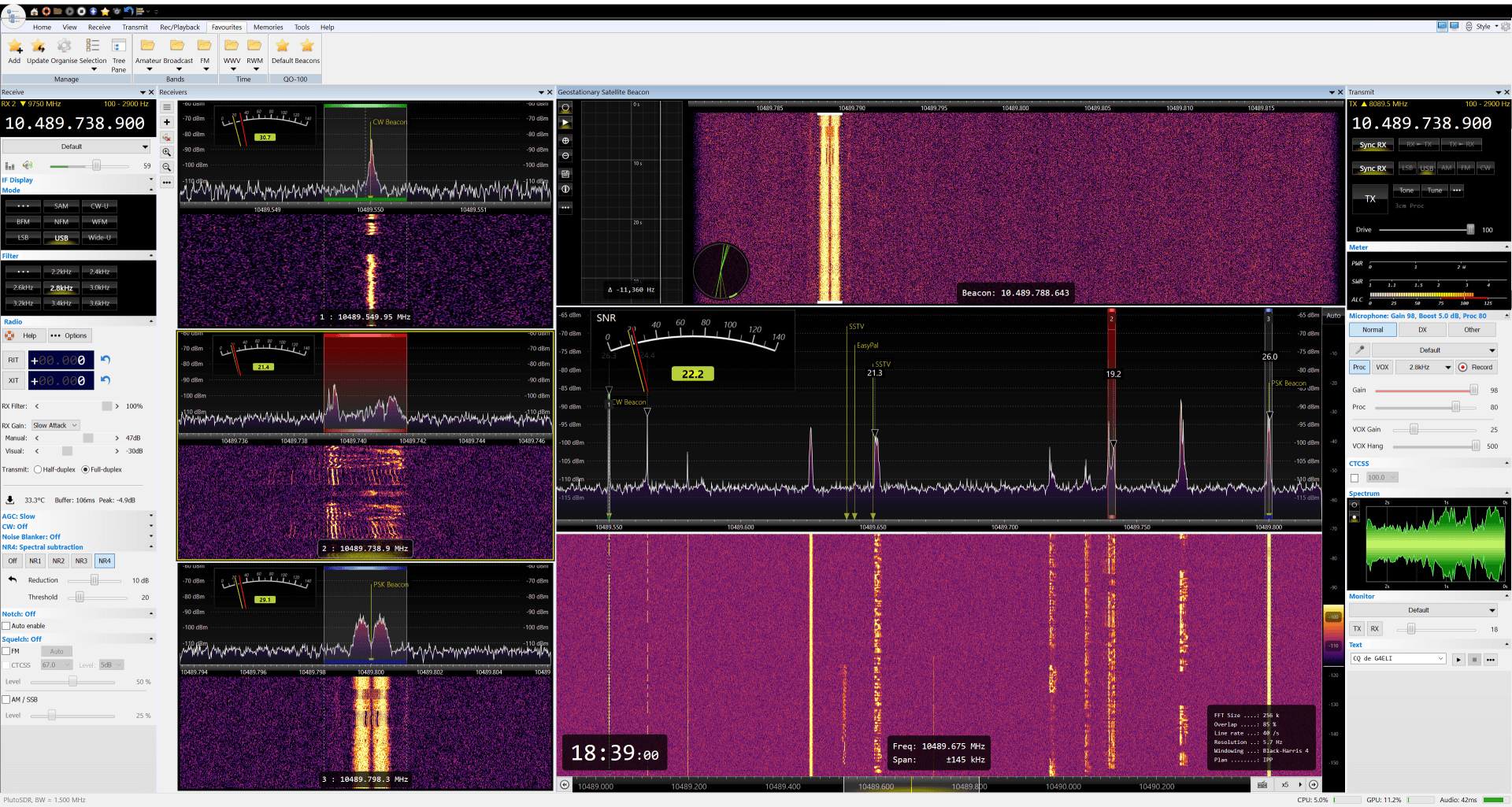 Did you know that the receiver pane docks intelligently when the height is greater than width (i.e. docked vertically) as shown below. In this screenshot the Pluto SDR is being used with the QO-100 satellite.